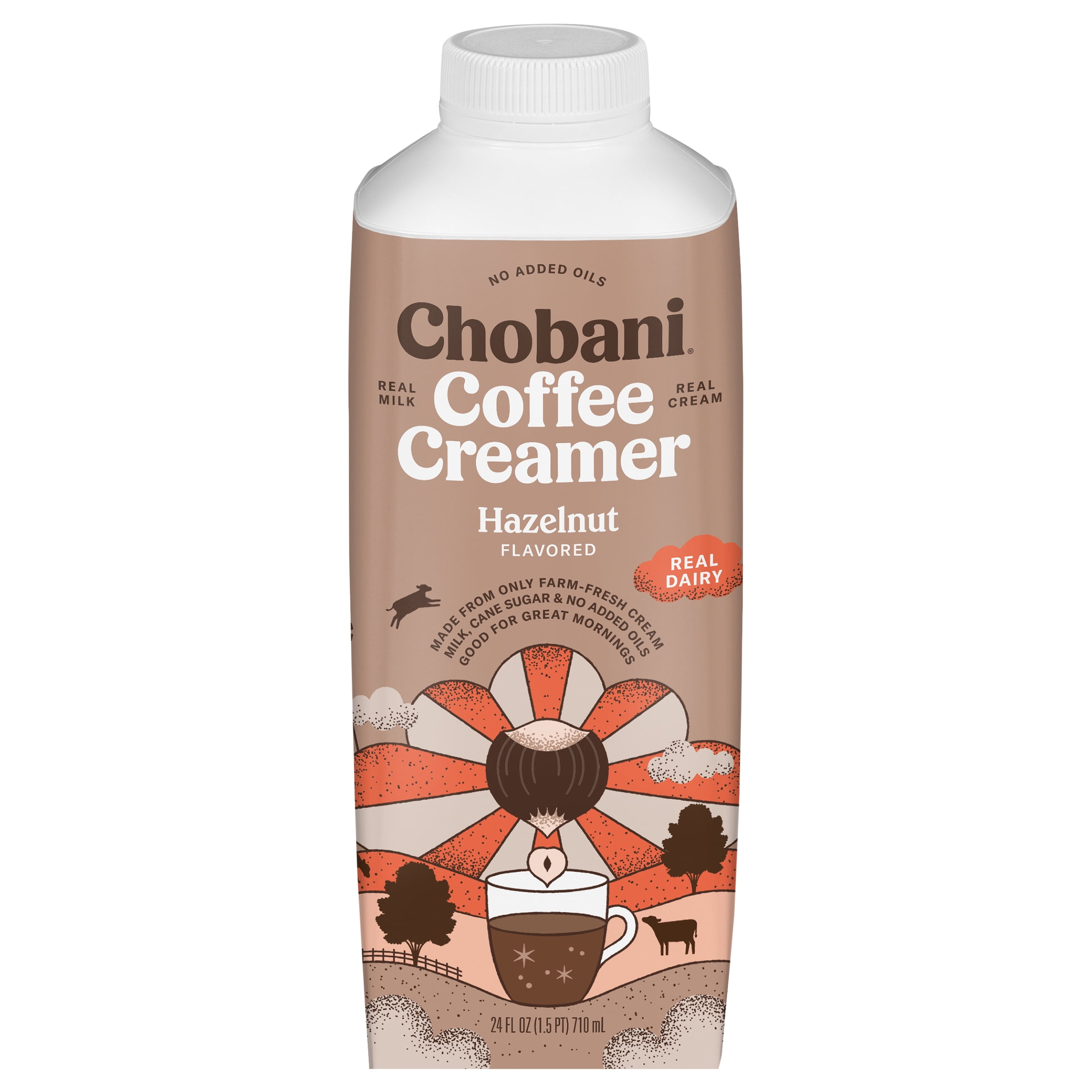 Naturally flavored Chobani Coffee Creamer comes in Hazelnut Vanilla Sweet Cream and Caramel.